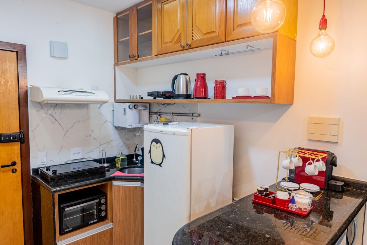 Seja um dos primeiros hóspedes a desfrutar do nosso espaço! Acabamos de lançar este apartamento de 1 quarto, extremamente confortável. Tudo novo em folha! Decoração moderna, funcional e clean. Conforto: Cama queen-size com colchão de alta qualidade e lençóis macios. Tecnologia: Smart TV 42 polegadas no quarto, Wi-Fi. Cozinha Equipada com geladeira, micro-ondas, fogão à gás, cafeteira e utensílios novos. 2 Banheiros, Ducha excelente, toalhas macias, ótimo espaço. NÃO ACEITA PETS E NEM CRIANÇAS.