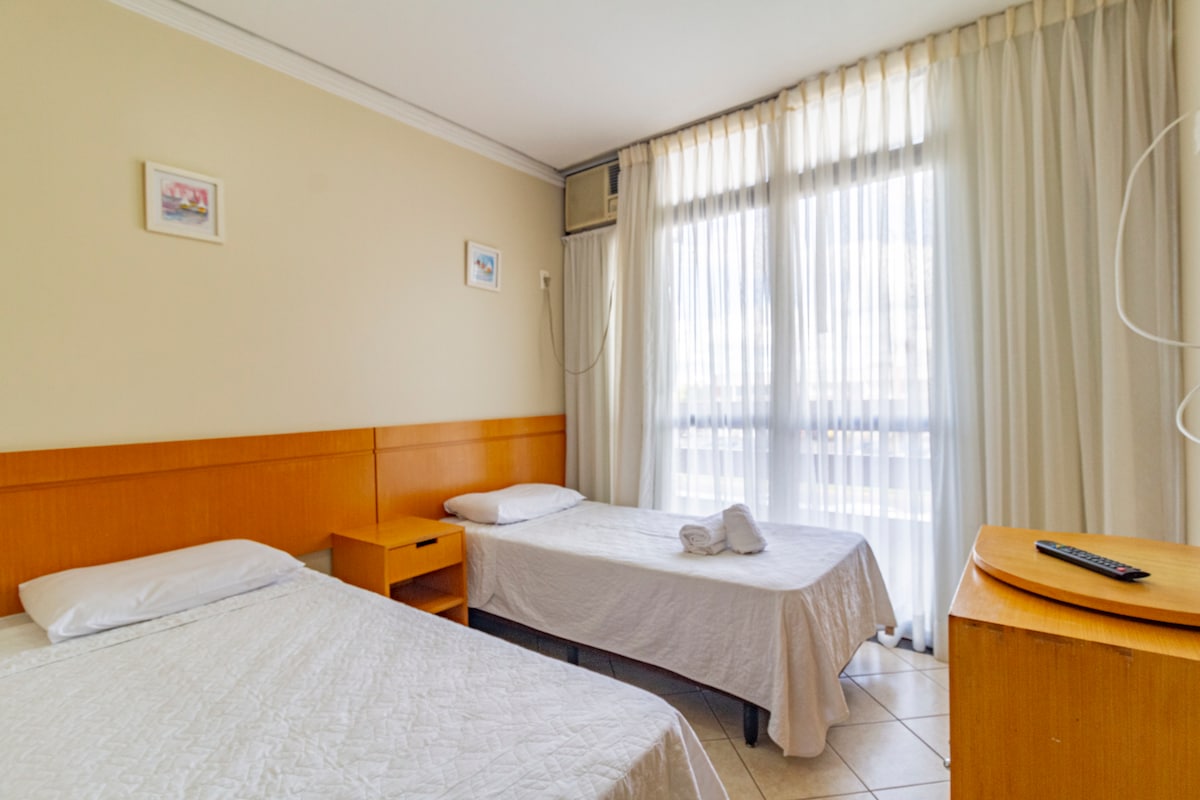 Valor da diária é pelo flat que comporta DOIS HOSPEDES! O flat possui DUAS CAMAS DE SOLTEIRO, um sofá espaçoso, cozinha compacta com itens básicos como talheres, pratos, facas, copos, xícaras, frigobar, microondas e airfray. Banheiro no quarto e secador de cabelo, Ar-cond, TV, WiFi do hotel, senha na recepcao, cofre eletrônico e uma pequena mesa de trabalho com duas cadeiras que podem ser utilizada para refeições! PROIBIDO FUMAR NO INTERIOR DO FLAT. MULTA DE 400 REAIS EM CASO DE DESCUMPRIMENTO.