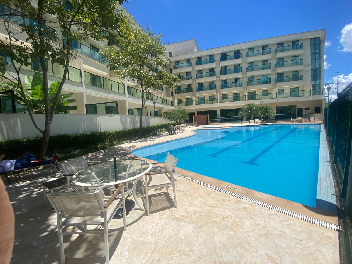 MAIS BEM AVALIADO FLAT BRASÍLIA 🗺️ Bairro Nobre ✈️ 15 min. do aeroporto 🛒 Ao lado do Supermercado 24h 🇺🇸 18 min. do consultado americano CASV 🛜 ⚡️Wi-Fi ❄️Ar cond. 🎥TV Smart 👨🏻🍳Fogao, Geladeira, Microondas e utensílios (Não temos filtro) 🅿️ Garagem privada a parte 🛁 Chuveiro, Toalha de banho, sabonete, shampoo e condicionador. ÁREA COMUNS 👙😎🩲 Piscinas, academia, Sauna, Jacuzzi (fechado às segundas) :. PROXIMIDADES A PÉ: Ⓜ️5 min Metrô 🛍️ 5 Principal shopping de Brasília