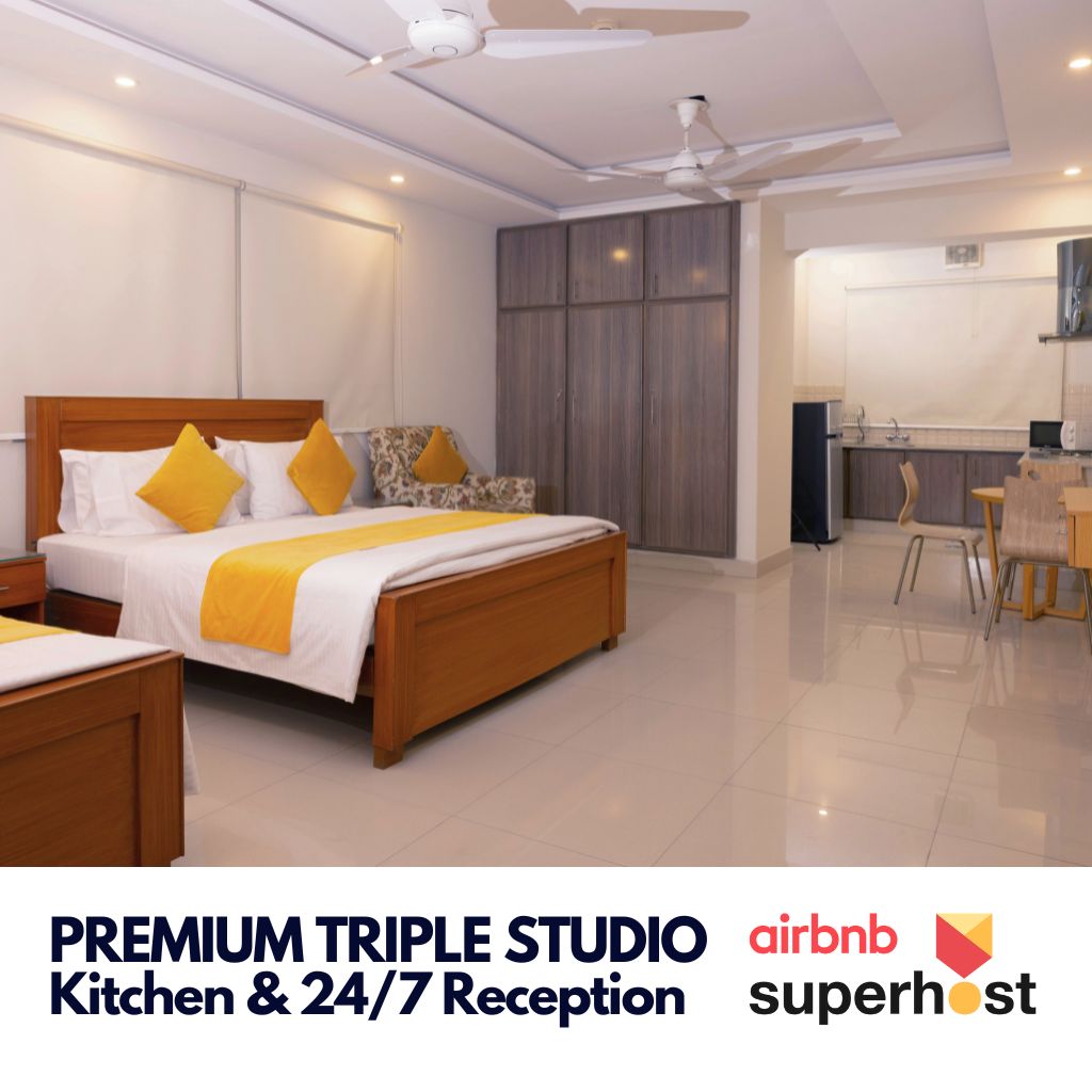 Our 1 BHK Orbit Penthouse in DHA Phase 5 is where urban chic meets celestial cool. Think: a glowing moon wall for those late-night selfies and a bold dollar-stacked art piece that screams "main character energy" Wake up to park views from your private balcony swing, binge your faves on the 50" 4K Smart TV, or cook up something aesthetic in the fully loaded designer kitchen. The interiors? Abstract, stylish, and made for the feed. Plus, you're right next to Lahore's hottest dining spots.