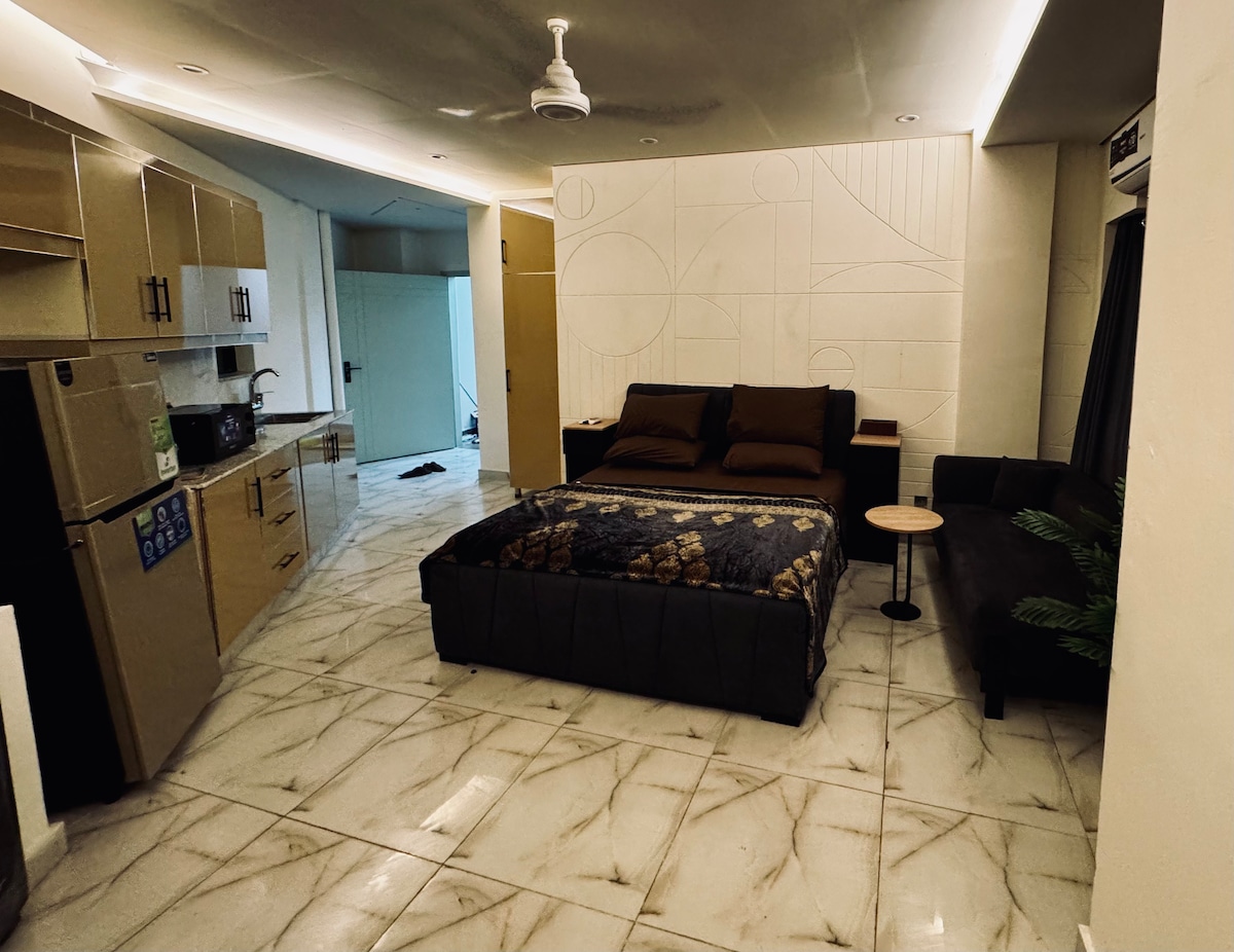 Sunlit Studio in PentaSquare DHA Phase 5 – Perfect for Families & Business Travelers This bright, modern sunlit studio with a garden view features a comfortable queen bed, well-equipped kitchenette, everything you need for a relaxing stay. Centrally located in DHA, walking distance from Cinnabon, Baskin Robbins, KFC, Imtiaz store & near Gulberg/AirPort. Self Check-in 55’’ 4K LED (Netflix) Wi-Fi 24 Hour Reception Central Cooling Room Service Tea/Coffee Bar Access to Park - Jogging Track
