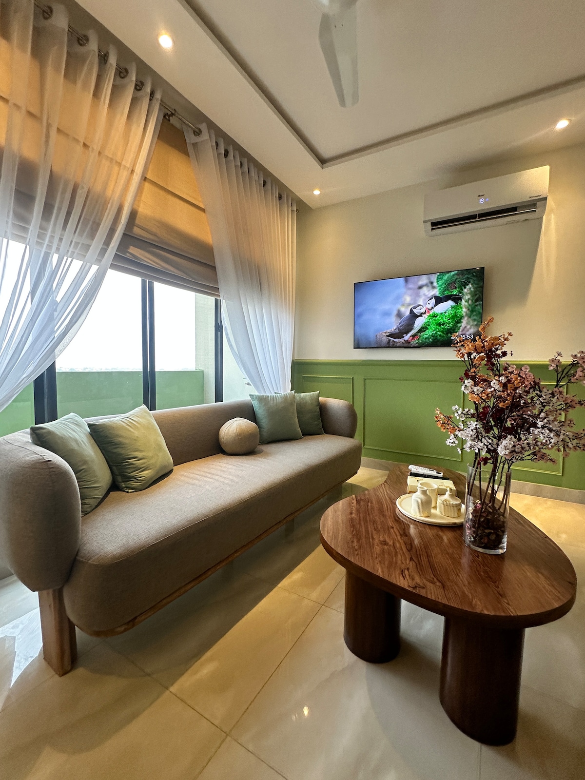 Welcome to Daró — a boutique, design-forward 1-bed apartment in the heart of Zameen Aurum, Gulberg III. Thoughtfully crafted with soft tones, modern furnishings and a calm hotel-like ambience, this space offers a private balcony, a stylish lounge with a 55” LED, a fully equipped kitchenette, fast WiFi, fresh linens, and 24/7 hot water. Ideal for married couples, business travelers, weekend escapes and long-term stays seeking comfort, convenience and a truly elevated experience in Lahore. 🌙✨