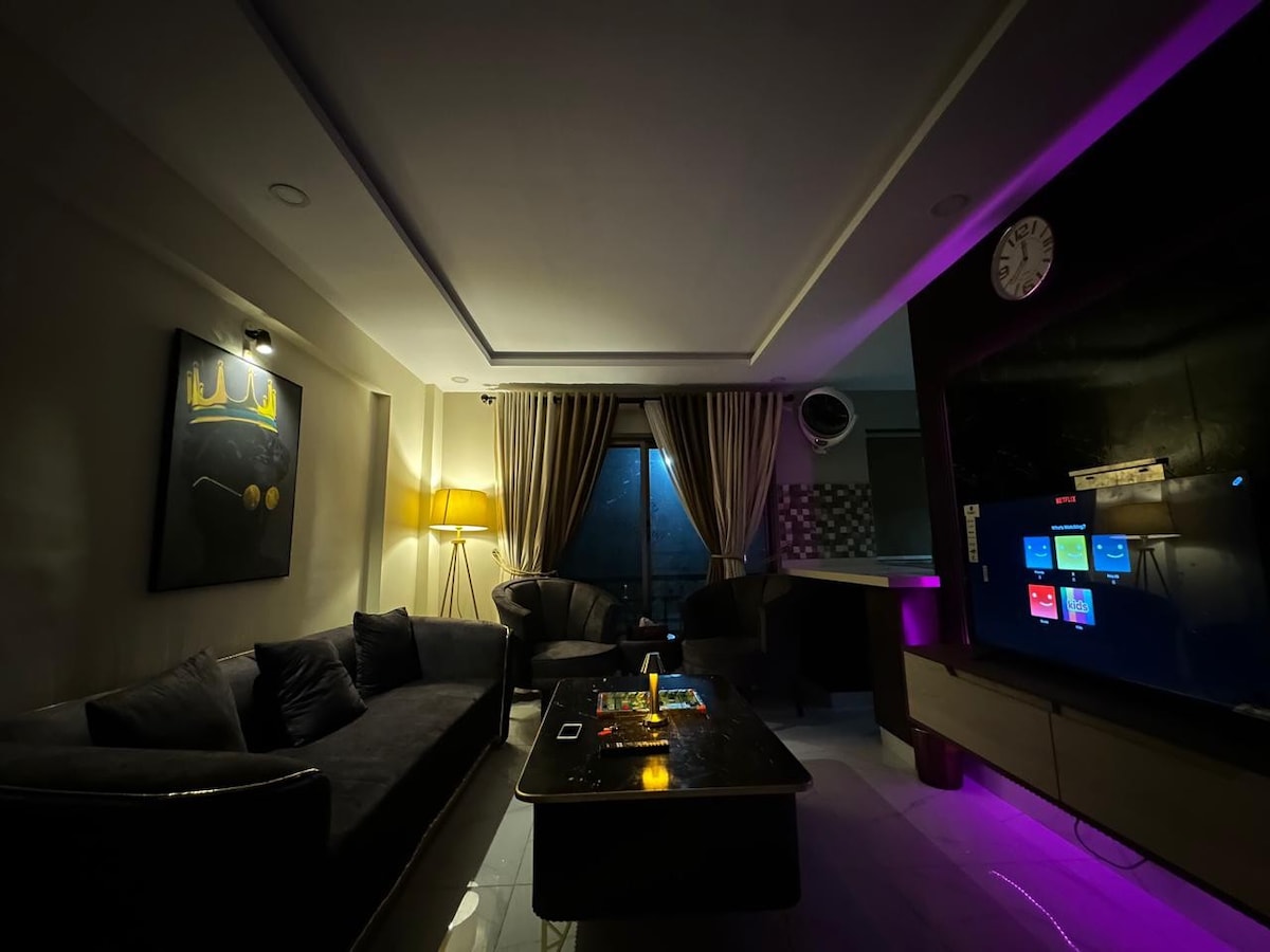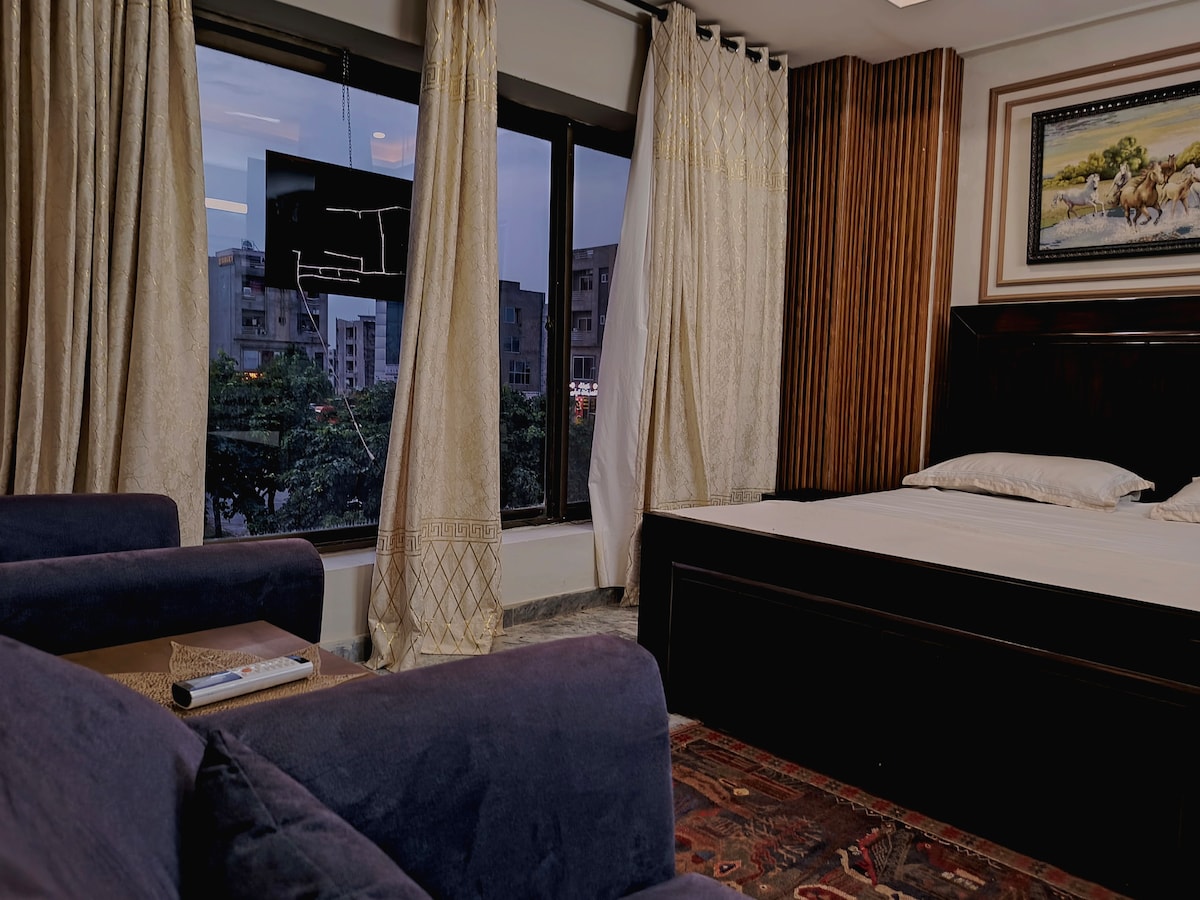 Welcome to The Royal Residence—A Stylish and modern living experience, located in Bahria Town, Rawalpindi, this stylish apartment features a subtle living area, a kitchenette, and a comfortable queen-sized bed for a relaxing stay. Living Perks ⦿24/7 heating & cooling (inverter) ⦿Free Snacks ⦿Balcony Location Perks ⦿1 minute walk to KFC, McDonald’s, Subway, Pizza Hut and all famous food chains. ⦿Secure building with 24/7 security *Only for friends and families* *Unmarried Couple Not Allowed*