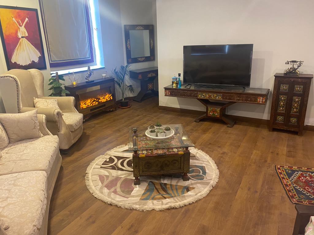 A spacious one Bed apartment King size bed Massage chair Pool table Sheesha for Sheesha lover Massive fire place 65” LED Sound system Netflix and chill Complementary snacks and drinks Bathroom amenities Fully equipped kitchen Heating and cooling system Free of cost cleaning services during the longer stays Scenic view from the terrace Assistance with the luggage available Self checkin available Staff available in the building till 9pm for assistance and to make your stay comfortable
