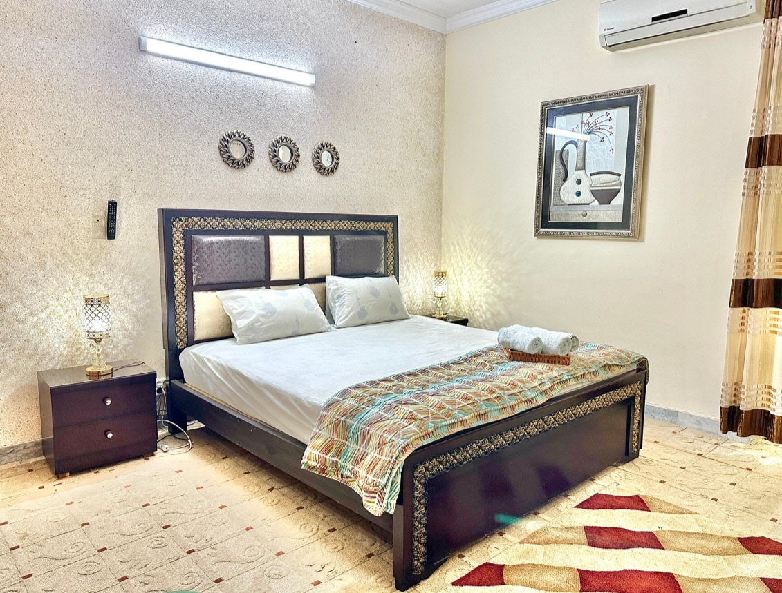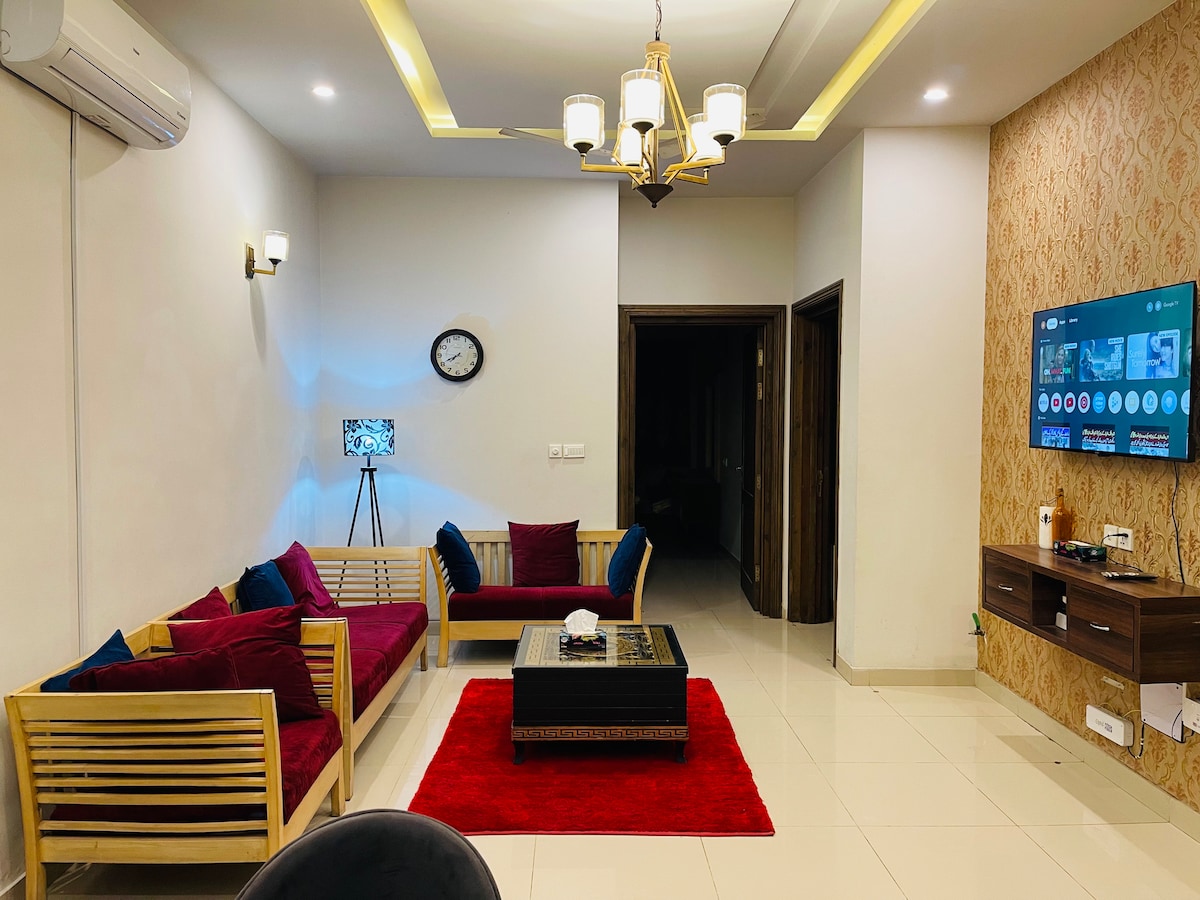 Welcome to our stylish two-bedroom suites in DHA 5 Islamabad. Enjoy the convenience of a quick commute and relax in a space featuring lovely decor and a fully-equipped home theater. Ideal for travelers seeking comfort and entertainment, this cozy retreat offers modern amenities in a prime location. It is a complete separate portion with it own separate entry and parking, family friendly, therefore very secure and peaceful. Parties & loud music is not allowed. Unmarried couples not allowed.