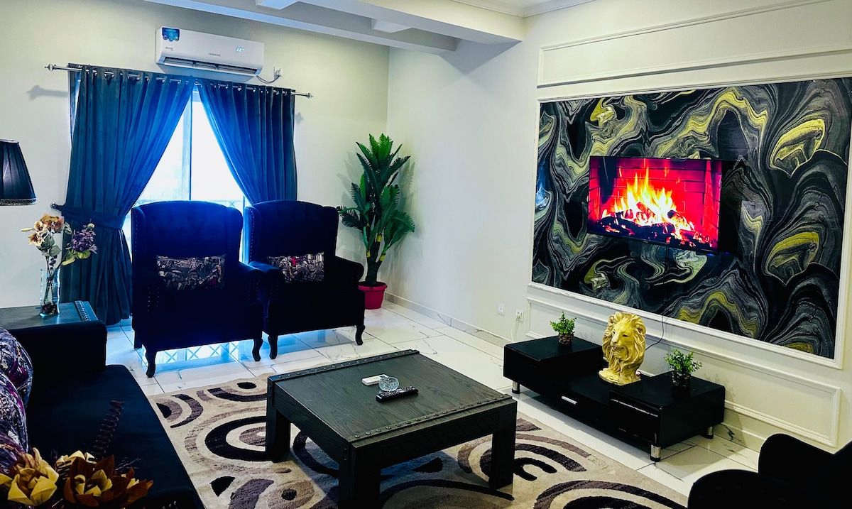 Designed with great care by an interior designer, The Black H comes with a spacious lounge and bedroom, huge 60" LED TV, 10-seater sofa, fully equipped kitchen and a distinctive decoration piece – an ibex's skull (Ethically sourced) – adding a rustic charm to the space. It is located in Bahria Heights 1 Block D, one of the most premium living standard maintained by Bahria Town. All major restaurants and cafes are close-by and building has 24/7 security