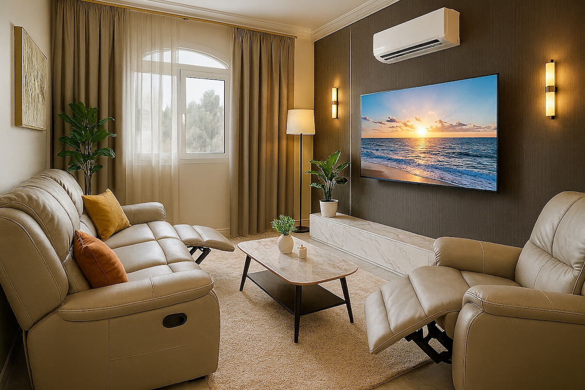 M.K1 Residence - Apt Near the Bridge 3 Bedrooms Fully Furnished 2 Bathrooms 1 Toilet 1 Living Room With A " 75" LG UHD Smart TV Wi-Fi "Fast Fiber Optic Internet" 5G Fully equipped kitchen Dining table Smart Entry Balcony with outdoor seating شقة بالقرب من الجسر 3 غرفة نوم 2 دورات مياه 1 مرحاض LG UHD Smart TV "غرفة معيشة مع شاشة "75 إنترنت (ألياف ضوئية) سريع مطبخ متكامل طاولة طعام دخول ذكي بلكونة مع جلسة خارجية