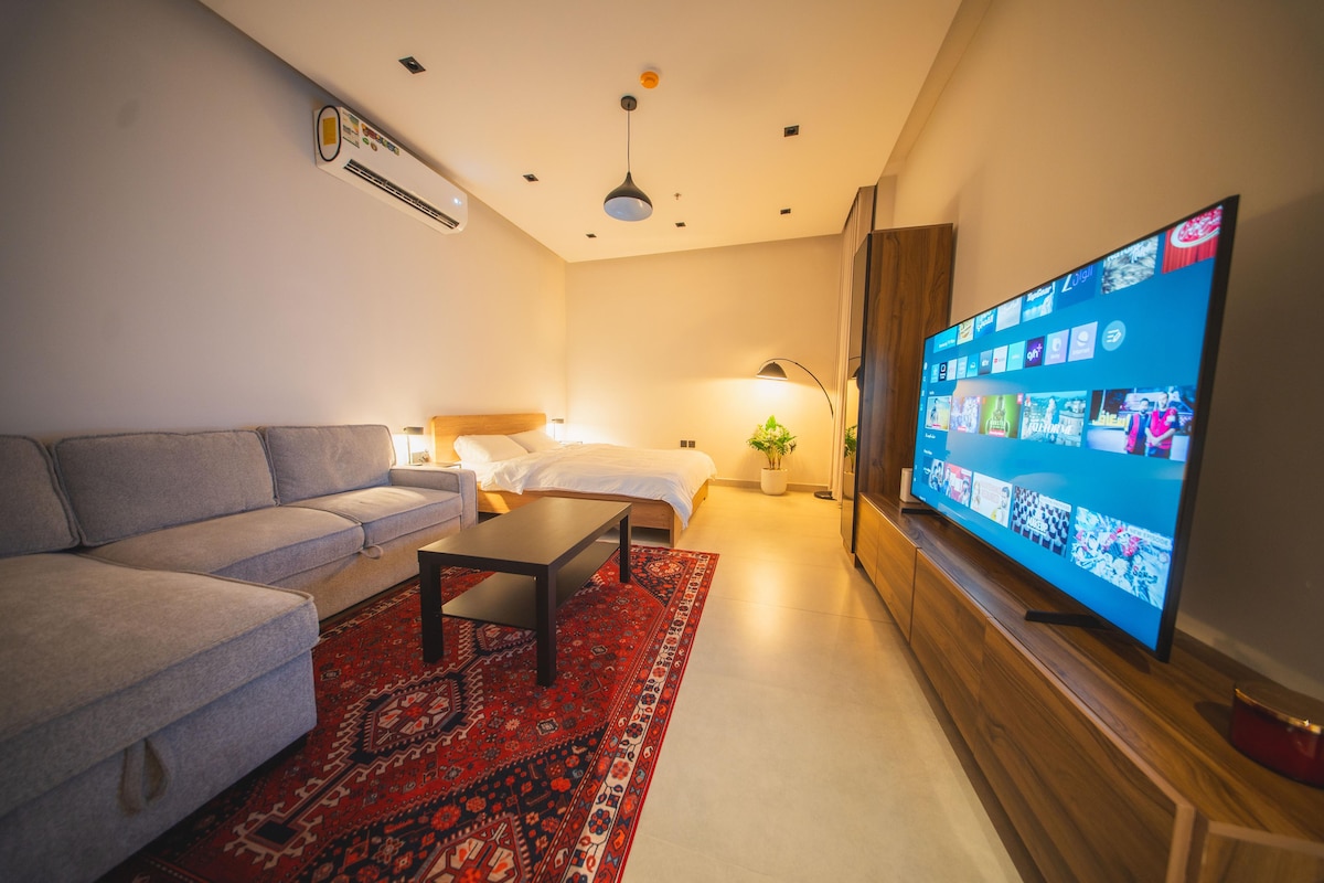 نوفر لك إقامة فريدة وراقية يتم فيها توفير جميع وسائل الراحة التي تستحقها، ونقوم هنا بتوفير وسائل الترفية من اشتراكات Netflix وShahid ، كما تحصل هنا على الخصوصية التامة وتسجيل الدخول الذاتي، في موقع مميز وقريب من جميع الاماكن السياحية والخدمية.