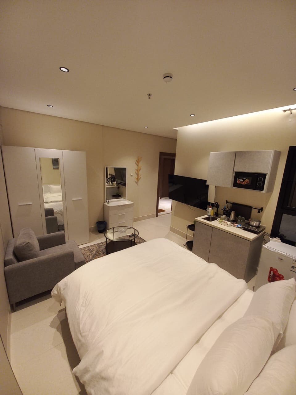 استديو يجمع كل الخدمات تحت سقف واحد يتميز بنوافذ كبيره من جهتين و ذكي بالكامل ستائر ذكية ودخول ذكي وشاشة ذكية و مفاتيح الإضاءة ذكية وجميع الخدمات في الشقة تعمل بالصوت مع خدمة Alexa - اثاث راقي بتصميمنا حديث وحصري خاص T Home - مرتبة مريحة مزوده بلباد فندقي من شركة stive الامريكية - اريكة مريحة وكرسي استرخاء من شركة pan Home - شاشة ذكية 75 بوصة - ايباد لوحي للتحكم بالاوامر الصوتية Alexa - مايكرويف - ثلاجة - مكوى مع طاولة كي - ركن قهوه - مناشف استخدام واحد - استشوار - شاور جل وشامبو