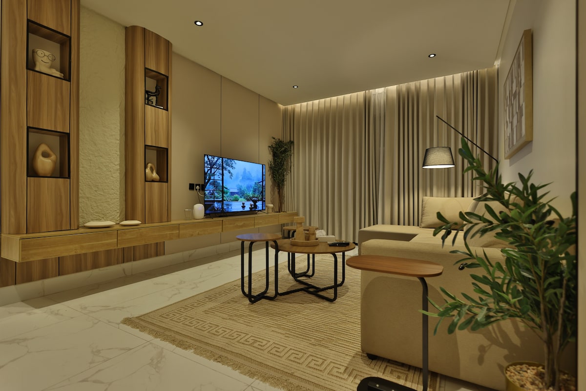 M.K1 Residence - Apt Near the Bridge 3 Bedrooms Fully Furnished 2 Bathrooms 1 Toilet 1 Living Room With A " 75" LG UHD Smart TV Wi-Fi "Fast Fiber Optic Internet" 5G Fully equipped kitchen Dining table Smart Entry Balcony with outdoor seating شقة بالقرب من الجسر 3 غرفة نوم 2 دورات مياه 1 مرحاض LG UHD Smart TV "غرفة معيشة مع شاشة "75 إنترنت (ألياف ضوئية) سريع مطبخ متكامل طاولة طعام دخول ذكي بلكونة مع جلسة خارجية