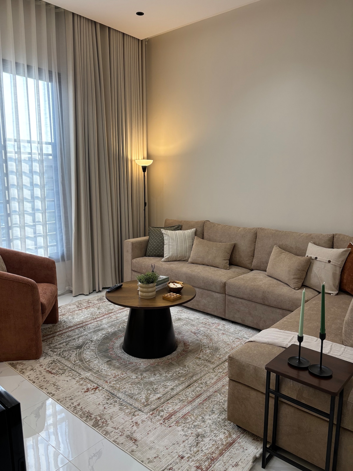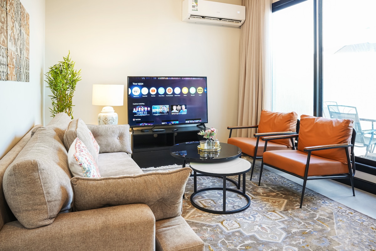 Enjoy a modern stay in Riyadh’s Olaya. This stylish apartment features a private balcony with outdoor seating, a cozy bedroom with smart separation, a comfortable living area, fully equipped kitchenette, in-unit washing machine, and workspace. Just an 8-minute walk to the metro, with Al Jazirah Hypermarket right across the street. The area is vibrant and full of restaurants and cafés—perfect for food lovers and business or leisure stays.