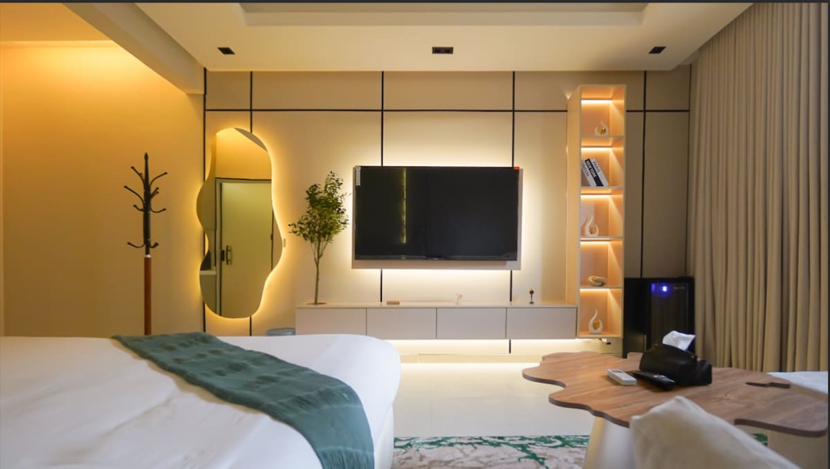 استوديو بتصميم دافئ ومريح، مثالي للراحة أو العمل. يضم سرير ماستر، شاشة 65 بوصة مع Netflix، ركن كوفي مجهز، ومنطقة جلوس. خدمة فندقية، واي فاي، طاقم نظافة ومشرف متواجد دائمًا لخدمتكم.