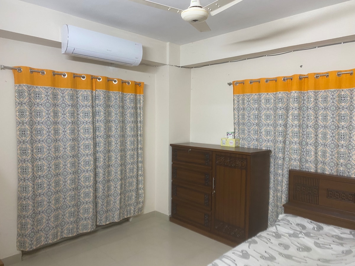 Private sanctuary with zenith comfort in this brand-new three-bedroom duplex penthouse in one of Dhaka's most prominent neighbourhood. Experience serenity of the place and is also close to all prime locations such as Hospitals, shopping malls, Metro Station & all major attractions of the city. Con’s: Unfortunately no elevator at the location; Pros: On 3rd floor so less stairs, have 1 car parking, WiFi & 24/7 security for a seamless stay. Rentable 3 rooms 1 has A/C and 2 without A/C. $49/night