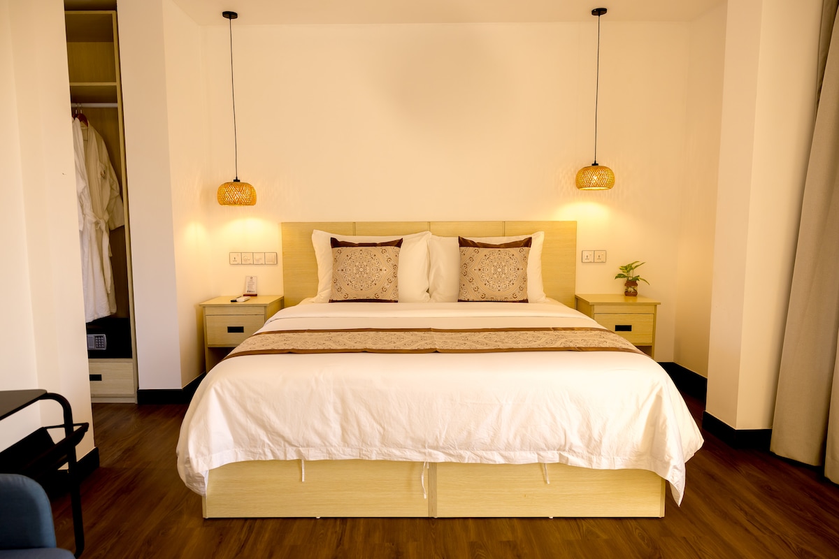 - With a carefully designed seven deluxe spacious rooms, our bungalow style hotel is nestled on the pristine island of Dharavandhoo, at the very heart of Baa Atoll, UNESCO World Biosphere Reserve, surrounded by pristine white sandy beaches and vibrant biodiversity. - We are just 5 minutes walk from the beach and have a huge terrace, outdoor dinning area and free Wi-Fi with plenty of work spaces. - We are just 10 minutes boat ride from world famous Manta/Whale shark point.