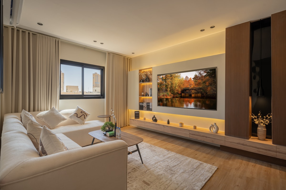 استرخ في هذا المسكن الهادئ والأنيق المكون من غرفة نوم ماستر بدورة مياه خاصه وصاله كبيره تتسع ل 6 أشخاص مزوده بتلفزيون سامسونج 85 بوصه بجميع الاشتراكات الرياضيه والأفلام ودورة مياه ومطبخ يوجد به جميع الأساسيات و بلكونه وكما يتوفر الواي فأي والمواقف وخدمة التنظيف طوال فترة إقامتك ومصعد لراحتك