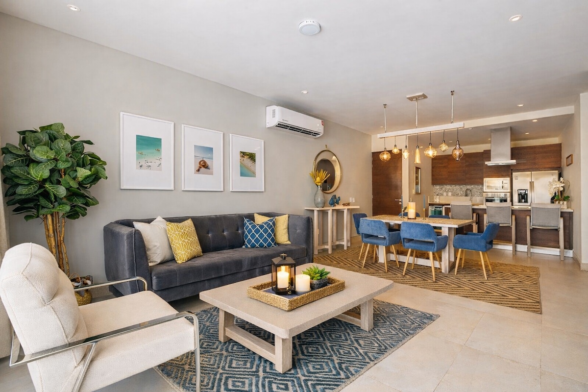 Enjoy this centrally-located condo nestled between the expansive beaches and golf courses in the heart of San Jose del Cabo's hotel district. You will have direct beach access just across the street. The space is professionally designed and brings the earthy vibes of SJDC to life making you feel right at home. The unit includes a fully equipped kitchen, classic beach necesities, and various other details.