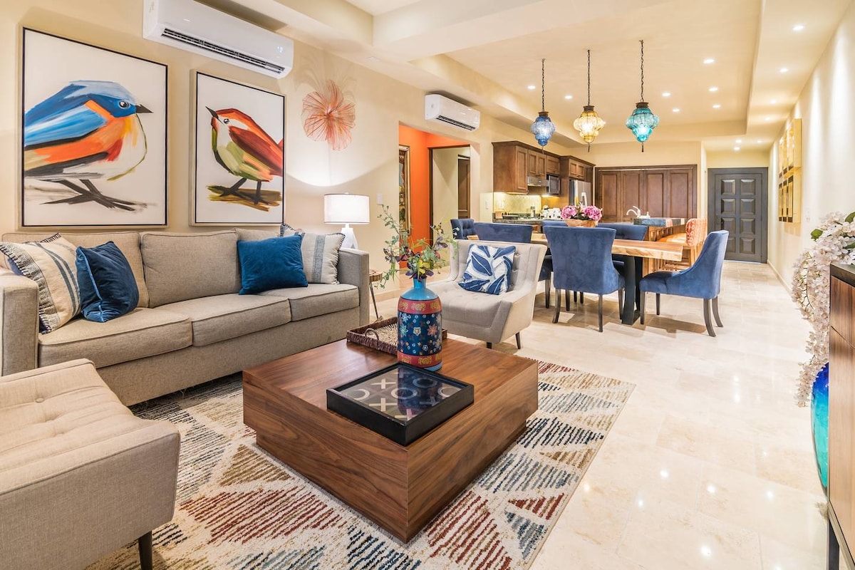 Beautiful contemporary Mexican decor condo with private terrace and garden. Perfect for family and friends!! Private community with pools, tennis court and gym!! Great location, walking distance to Costco, only 8 minutes drive to Medano Beach and downtown. Vista Vela II is about 40 min away from the airport. It is a safe, closed complex with 24/7 surveillance.