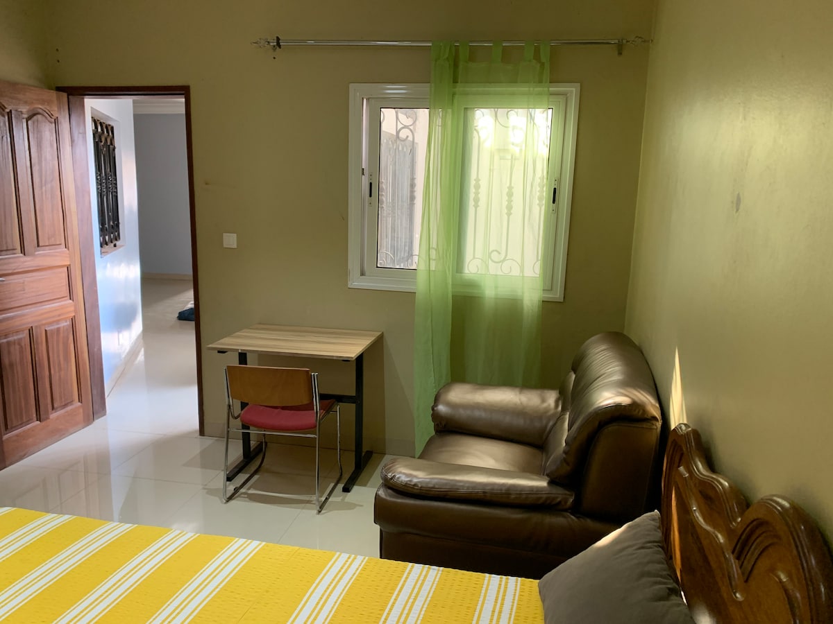 Chambre privée avec douche privée dans un couloir, située dans un appartement calme au centre de Saly. À quelques minutes des commerces et de la plage, cet espace est également idéal pour les travailleurs nomades grâce à son haut débit internet et son coin bureau confortable. Parfait pour allier travail et détente.