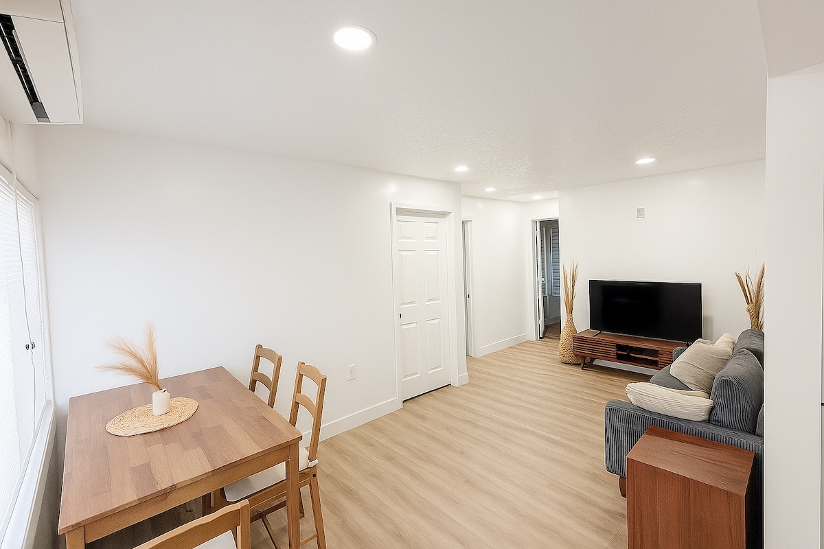 A completely new and renovated studio with your own easily accessible parking space, a private entrance, kitchen, and bathroom. It includes a queen size bed and a double twin bed. There is a large couch in front of a widescreen Roku TV with Netflix, an air conditioning/heating unit, a microwave, and laundry room. 我們也說中文