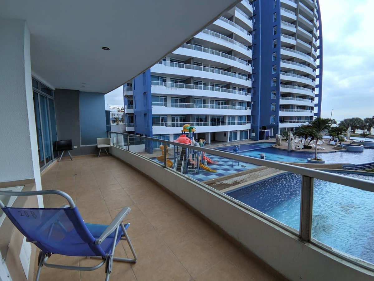 Quieres escapar de la rutina laboral y disfrutar con tu familia ? Este hospedaje es para ti, bonito , tranquilo y cómodo. Con servicios de restaurantes , farmacias , supermercados y gasolineras muy cerca, y la playa a solo 5 minutos caminando o 1 minuto en auto. Contamos con parqueadero y ascensor panorámico; el departamento tiene capacidad para 8 personas cómodamente. Ven y disfruta de una gran piscina, también hay una para niños y termina relajándote en el hidromasaje, sauna y turco. No 🐶🐱🚫
