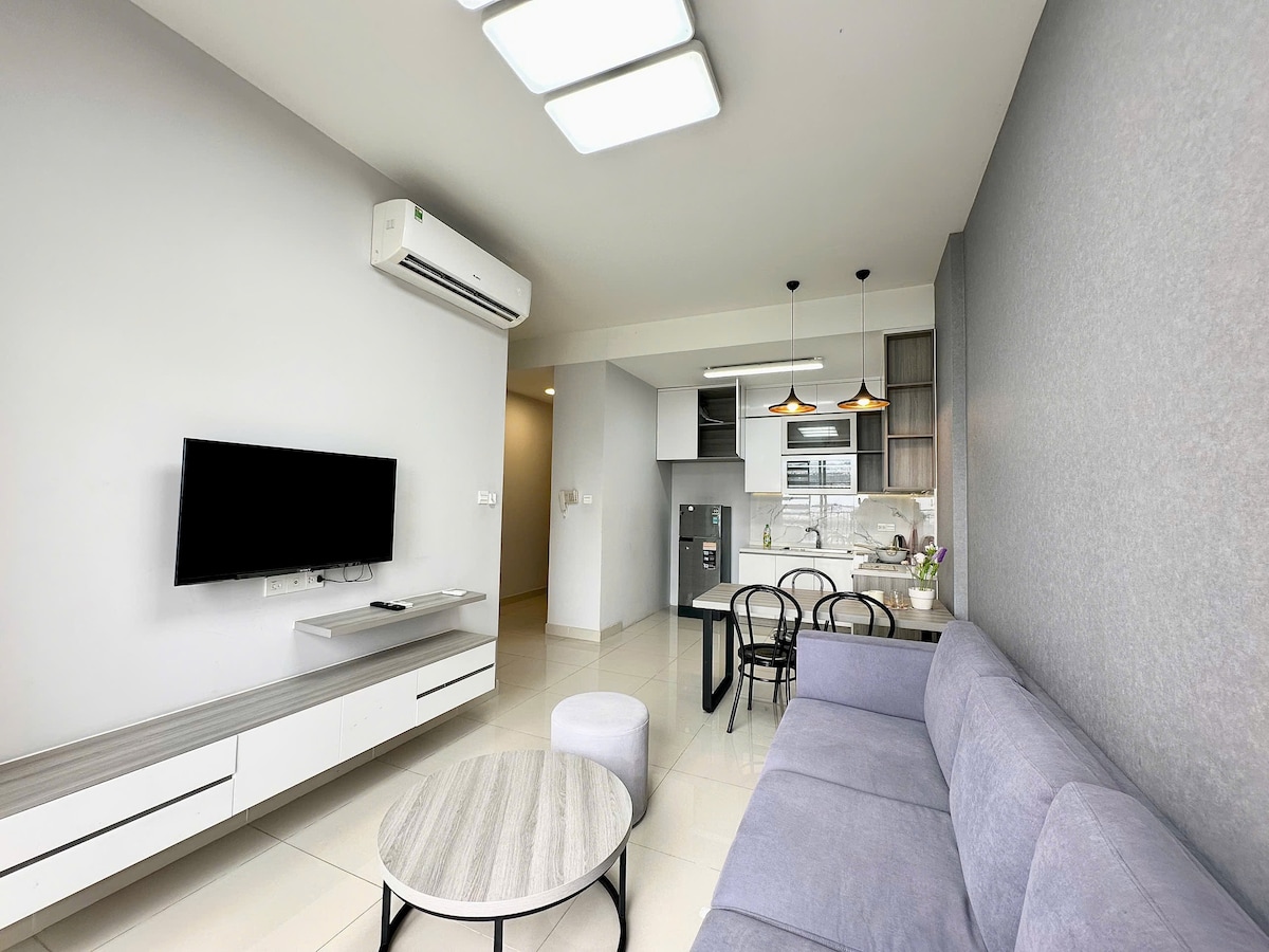 🌿 Experience breathtaking fireworks without the crowds, right from the comfort of your home. Relax with a glass of wine as the sky lights up — a truly unforgettable stay. 🌿 This spacious 2-bedroom corner apartment in Diamond Island, offers a serene escape with breathtaking views of the Saigon River and the shimmering city skyline — where you can witness both the peaceful sunrise and the golden glow of sunset right from your balcony.
