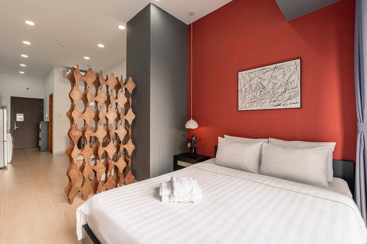 This unique place is designed for a luxury-in-style experience. With a smart sliding door, your living room and bed room are easy connected to maximize spacious 50m2 house. Walking on the BaSon bridge between the condo and D1, you can feel the breeze of Saigon river and spectacular view of the city. By just 5 to 10 min on cab, you can get to city center.