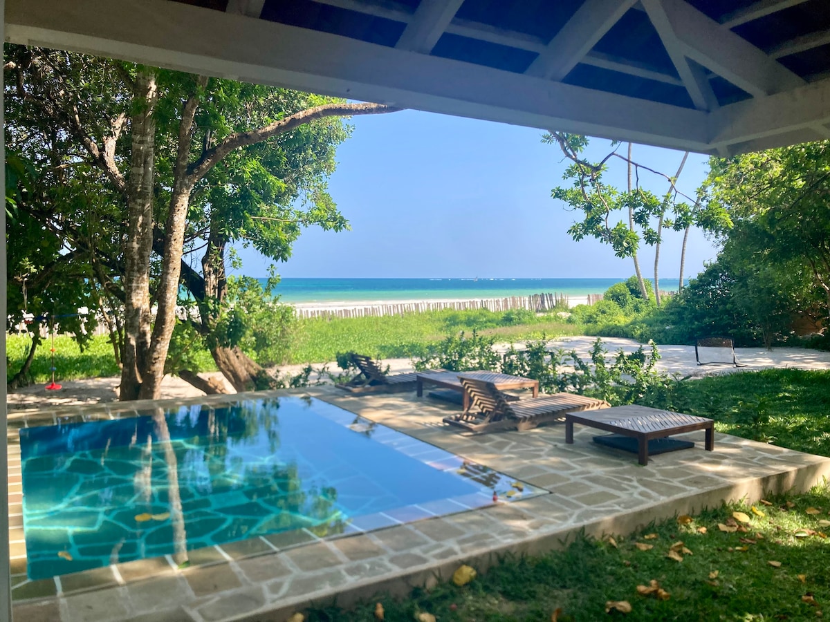 Escape to our enchanting beachfront cottage, nestled in the heart of Galu, Diani. With a private pool, an ample veranda, and a stunning terrace, our tranquil haven promises a restful stay in paradise. Immerse yourself in the coastal breeze, marvel at the spectacle of humpback whales leaping outside the reef during their migration, and partake in world class water sports while enjoying access to a giant pool just step from your private oasis.