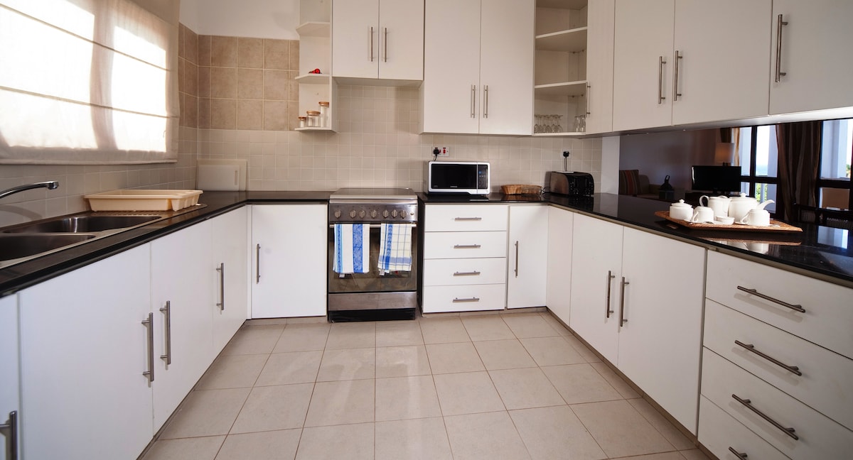 Welcome to our spacious 2-bedroom apt 5 minute drive to the beach & with free access to 4-star beachfront resort for swimming & Beach. ✅S𝐰𝐢𝐦𝐦𝐢𝐧𝐠 Pool & 𝐛𝐞𝐚𝐜𝐡 are a free access through 𝐉𝐚𝐜𝐚𝐫𝐚𝐧𝐝𝐚 𝐁𝐞𝐚𝐜𝐡 𝐑𝐞𝐬𝐨𝐫𝐭. Conveniently located less than 5 minutes from Diani Airstrip for quick and 3 minutes to shopping center. Sleep in comfort with 1 King Bed in the master bedroom, & 1 Queen Bed + 1 Double Bed in the second bedroom and a sofa bed.
