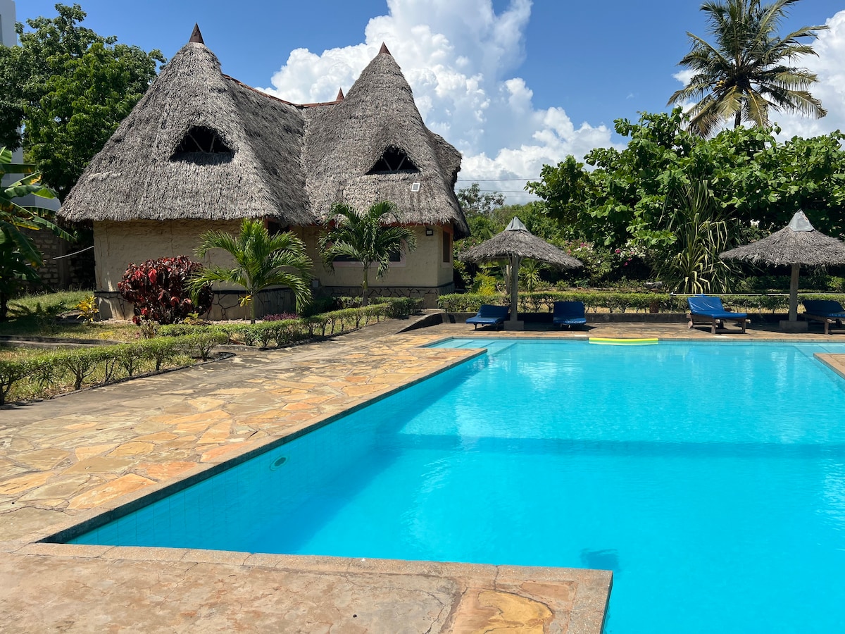 Delightful one bedroomed self contained guest house in mature compound, only paces away from one of the most beautiful beaches in Kenya. Five minutes from the shopping centre, airstrip, golf course and hospital. Free pick up from local airport and from Mombasa cost 6000 ks.local trips can be arranged and, trips to Mombasa to see the old town and Fort Jesus. we have the famous endangered Colobus monkeys in the garden. most afternoons we have a wooly necked stork sometimes 2 visiting the pool.
