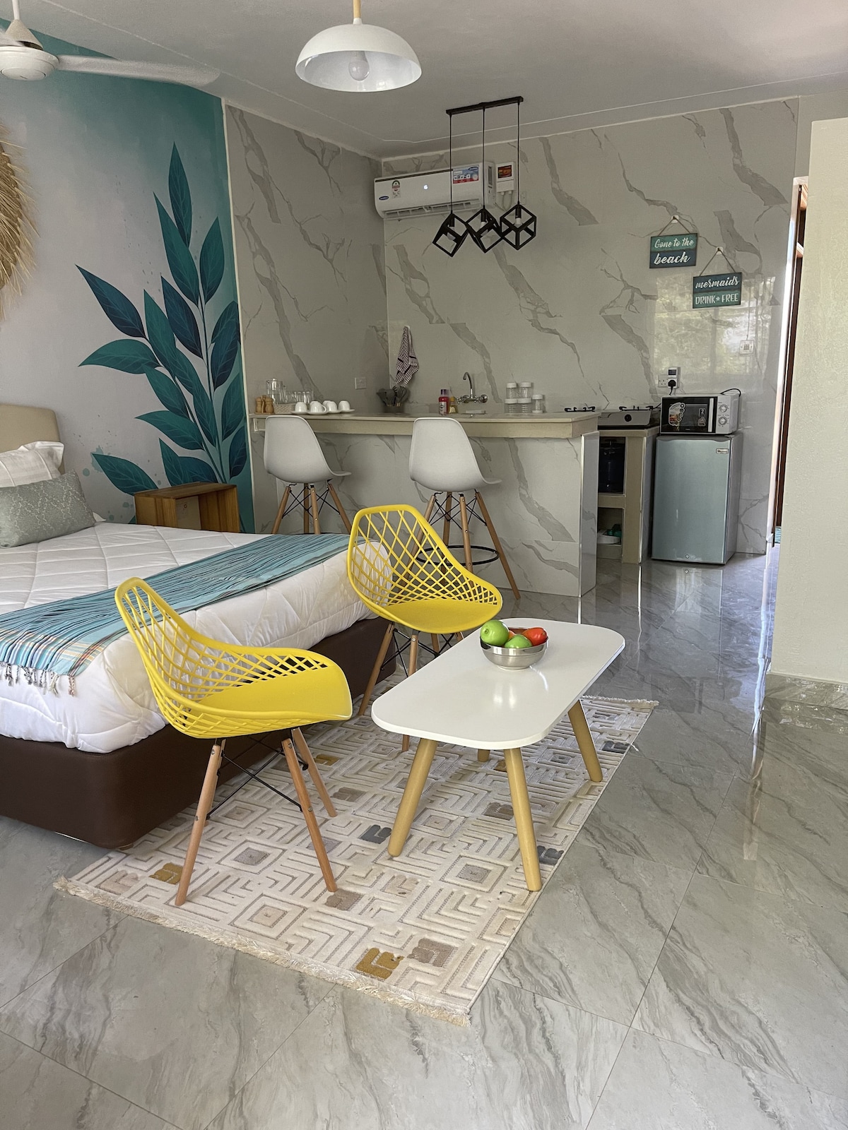 A simple, less is more interior decor 1bedroom house in Central Diani. Spacious, bright and perfect for short or long stays. A comfortable large sofa bed chair in the living room, flat screen smart TV, fast wifi and a dinning area that can be used as a study/work table. A fully equipped kitchen, queen size bed in the bedroom, a clean bathroom stocked with towels and toiletries. High roof with ceiling fans, extra standing fans, dehumidifier & large louvre glass windows for air circulation.