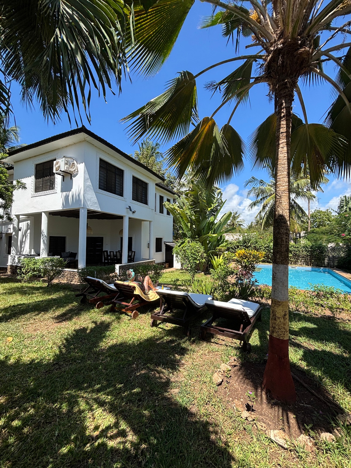 Relax in the most beautiful, fully private Villa in Diani Beach. Quiet, tranquil and close to shops, restaurants and entertainment. An oasis surrounded by palm trees invites you into a tropical garden- short walk and you are at the best voted white sand beach in Africa Privacy- enclosed is a large beautiful blue pool, cleaned daily to ensure a prestine experience. Satellite internet ensuring minimum drop out and speeds up to 100mb+ A Chef on request who will bbq on charcoal whatever you wish.