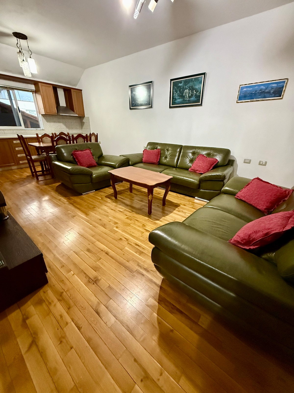 Cozy 2-bedroom apartment with jacuzzi, living room, and stylish kitchen-balcony. Located in a quiet area just 4.7 km from Tirana center, 3 min from bus stop with service every 5 min (05:00–23:00). Family-friendly, near supermarkets, bakeries, markets, pharmacy, and sports areas. Perfect for relaxing and exploring nature and the city. Close to Top Attractions: Bunk’Art Museum 5 min walk Dajti Express Cable Car 5 min walk Linzë Lake 8 min walk Select Hill Resort 9 min by car. Scenic hiking trails