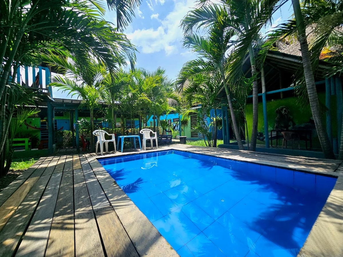 Amazing house in the center of Palomino only 3 blocks to the beach, river, and downtown. On a quaint tree lined street. The house contains 2 Bedrooms, a large living & dinning room, kitchen, and bathroom featuring an open air shower. We have a great patio and pool with outdoor dinning area and hammock, as well as expansive grounds. Enjoy the tropical excitement of this special place right next to a beautiful national park. Nature and convenience await you, including fast Starlink Internet.