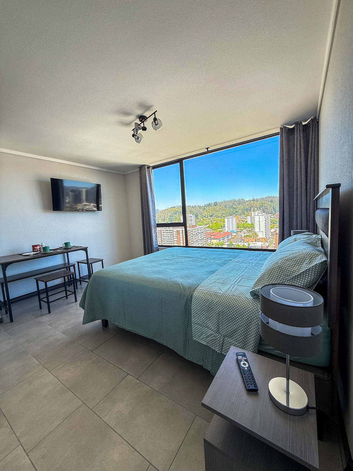 Disfruta de nuestro estudio en el corazón de Concepción, cerca de universidades, transporte, centros comerciales y restaurantes. Ideal para dos personas, el departamento incluye cama de dos plazas, cocina equipada, baño con tina, smart TV y mesa para trabajar/comer. El edificio ofrece gimnasio, sala de coworking, sala de entregas, lavandería, quinchos panorámicos y salón gourmet. ¡Conveniencia y confort en una ubicación central!