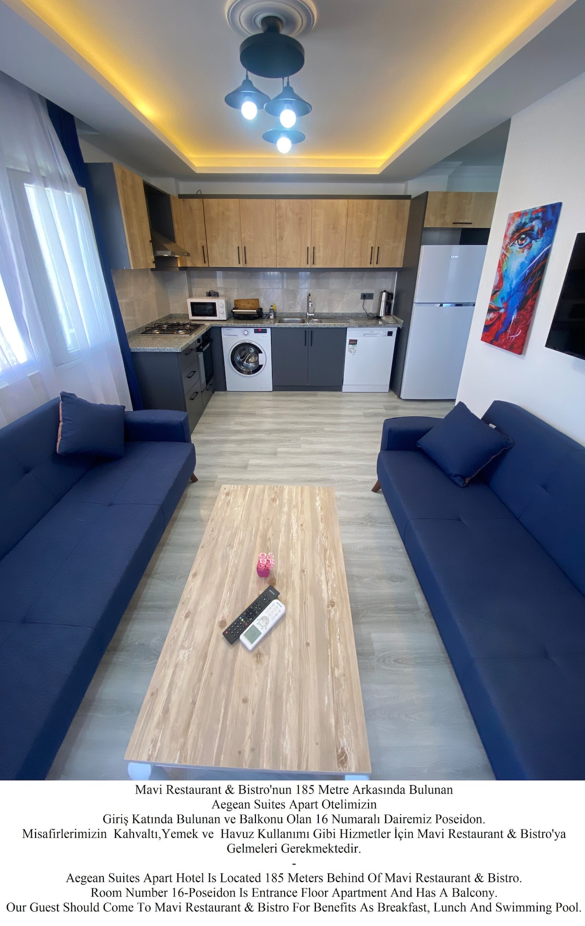 Mavi Restaurant & Bistro'nun 185 Metre Arkasında Bulunan Aegean Suites Apart Otelimizin Giriş Katında Bulunan ve Balkonu Olan 16 Numaralı Dairemiz Poseidon. Aegean Suites Apart Hotel Is Located 185 Meters Behind Of Mavi Restaurant & Bistro. Room Number 16-Poseidon Is Entrance Floor Apartment And Has A Balcony.
