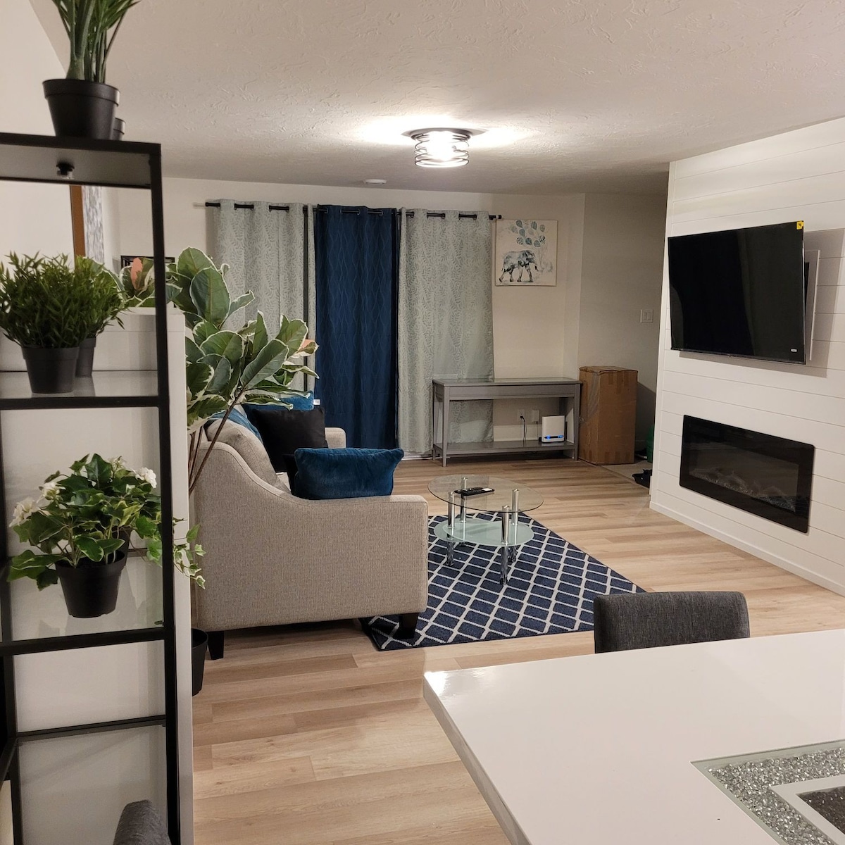 Our upstairs, apartment is separate from house and features open concept (600 sq feet) living. Living room with TV and fireplace, Bedroom, Kitchen with island & eating area, desk or vanity, washer & dryer, bathroom with large sit down shower. Quiet neighborhood, lots of trails, shopping and adventures nearby. Magic Mountain, Parlee Beach, 5-8 min to Downtown Moncton - Avenir Centre. 15 min to Airport. 30 min to Shediac or Hopewell Cape Rocks, 1.5 hrs to Fundy National Park. Key code access