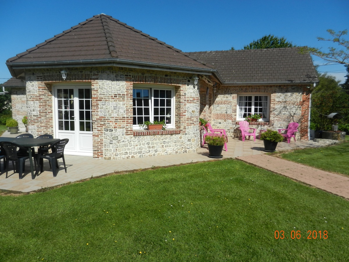 3 chambres mansardées à l étage d une longère typique de la région restaurée en gardant son caractère authentique (1 chambres triple lit de 160 + lit de 90, une chambre double lit de 140, une chambre quadruple avec lit de 160 et 2 lits de 90) 1 chambre double (lit de 160) au rez-de-chaussée avec salle de bain Situation : A 5 mn de Veules les roses et Saint valery en Caux Au total 3 salle de bains et 3 toilettes 30 mn de Dieppe 40 mn d'Etretat