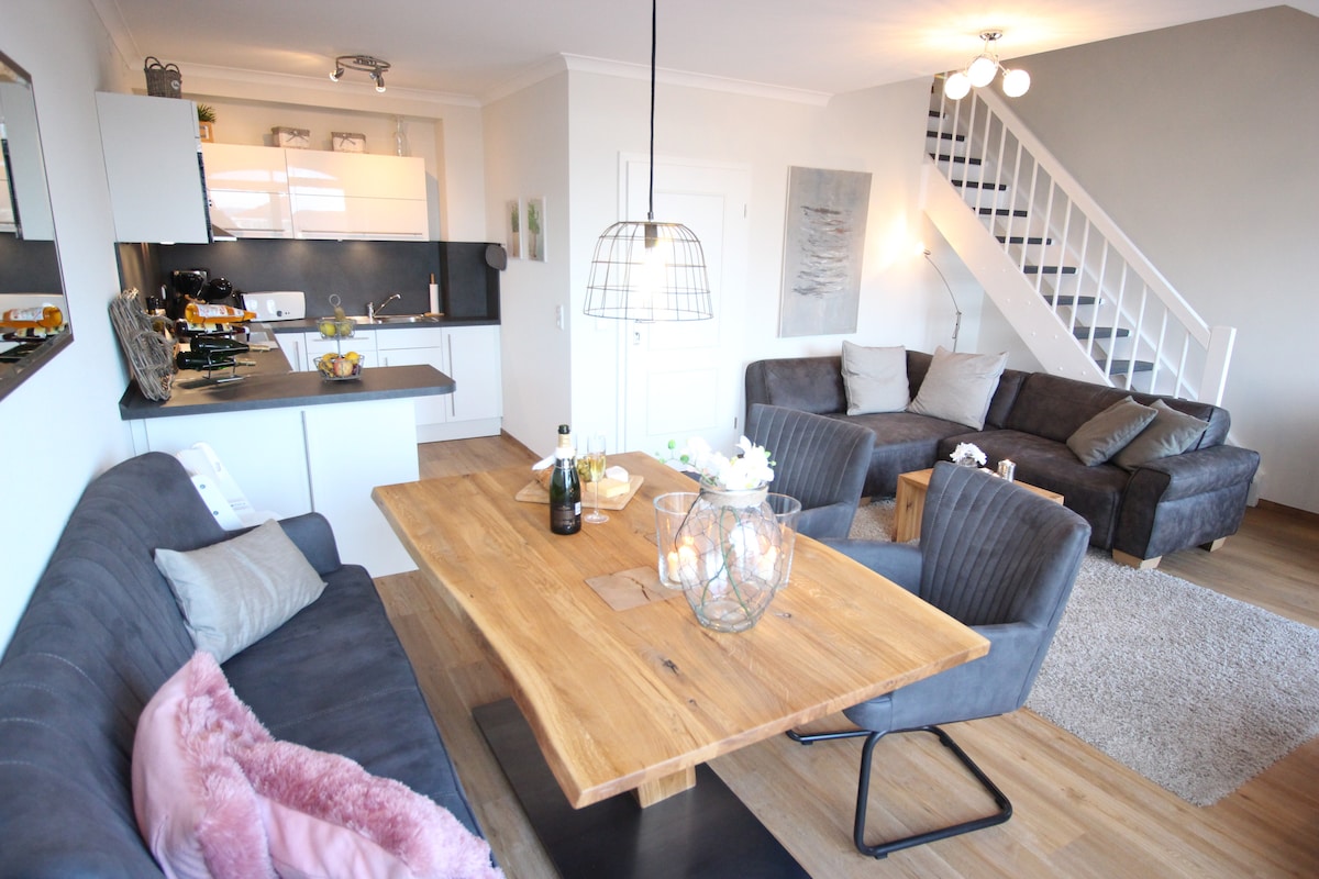 Unter unserem Reetdach haben Sie den Bodden im Blick – die 70 qm große Wohnung teilt sich in zwei Schlafzimmer und einen sehr großzügigen Wohn- und Essbereich auf. Hinzu kommt ein Badezimmer mit Dusche, Toilette und kuschliger Eckbadewanne. Im Wohnbereich mit Sofas und Sessel sorgt der Kamin in stürmischen Zeiten für wohlige Wärme. Die voll ausgestattete Küche lädt zu geselligen Kochabenden ein.