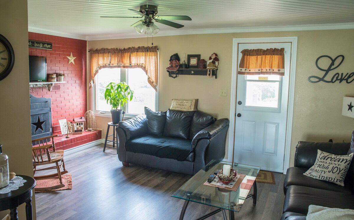 Harmony Cottage was the estate's guest house. There is a large living/dining room with a fireplace, smart TVs, and comfortable seating. The kitchen has all appliances (stove, microwave, dishwasher, coffeemaker, fridge), and is equipped with dishes and pots. There is a private deck and large fenced yard. The second floor has two bedrooms with AC and queen size beds. One room has an additional single bed as well. The bathroom has the original claw-foot tub and a full-size washer/dryer.