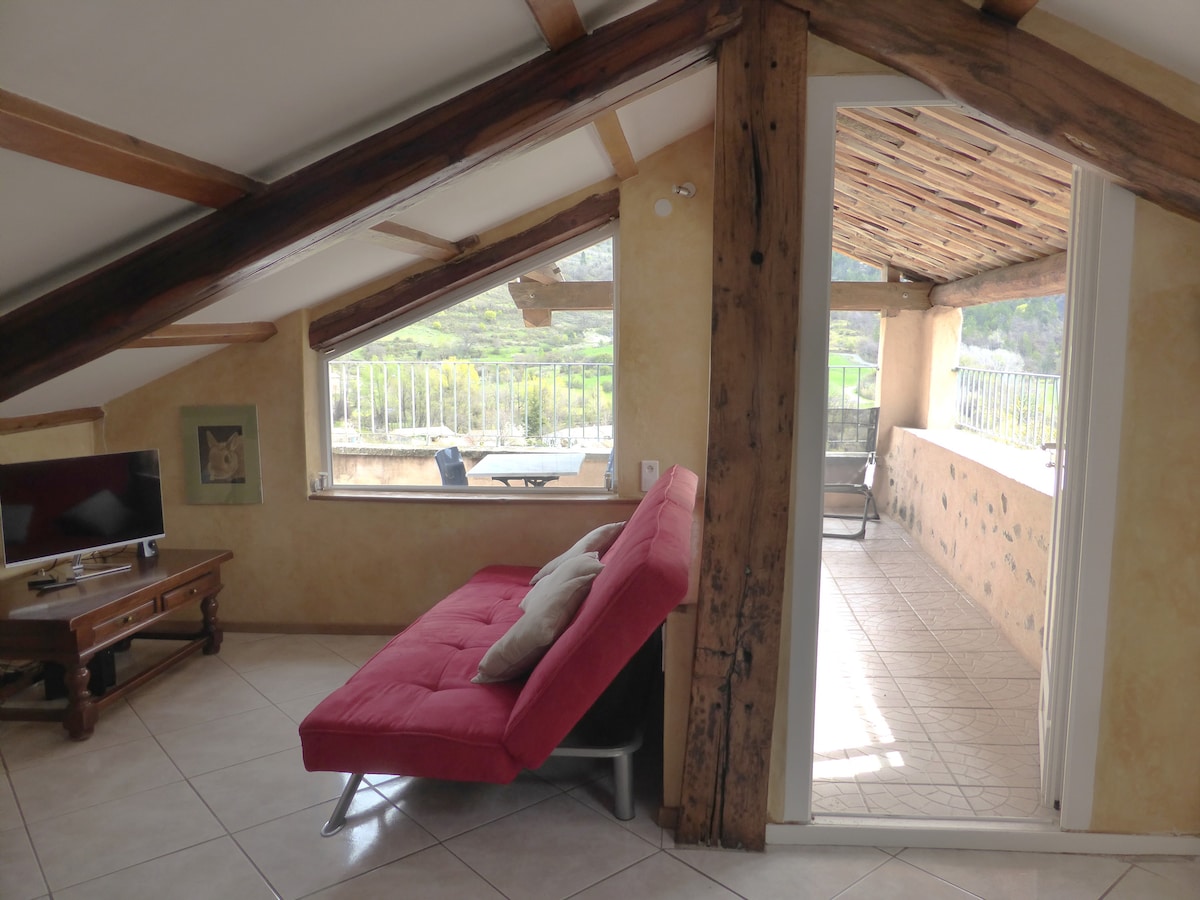 Appartement calme en rez-de-chaussée (une marche à l’entrée) comprenant un séjour, une cuisine, une salle de bains. Vous trouverez une grande chambre sous toiture à l’étage avec Velux (et volet roulant électrique) Climatisation Accès autonome grâce à une boîte à clé Idéal pour visiter Sisteron, perle de la Haute Provence