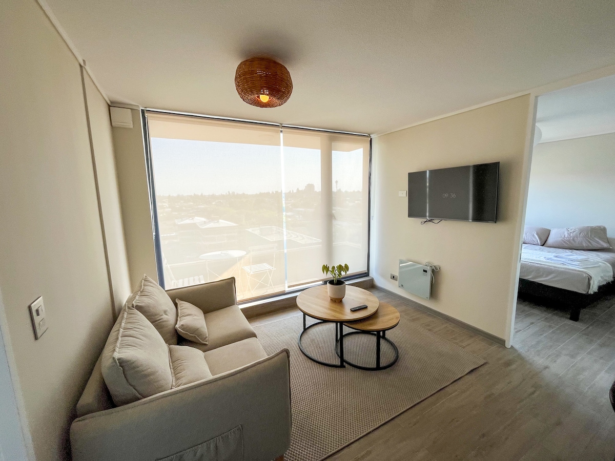 Moderno departamento estilo minimalista, de un ambiente, ubicado en pleno centro de Chillán. Totalmente equipado ideal para quienes buscan comodidad, tranquilidad y conectividad. A dos cuadras del mall Arauco Chillán, plaza de armas, catedral, cercano a bancos, variedad de restaurantes, supermercados, terminal de buses, locomoción a la puerta y otros servicios esenciales. Cuenta con WiFi, Smart TV de 40’ con Netflix, Disney, Max y canal del fútbol TNT sport, lavandería, gimnasio y sala cowork.