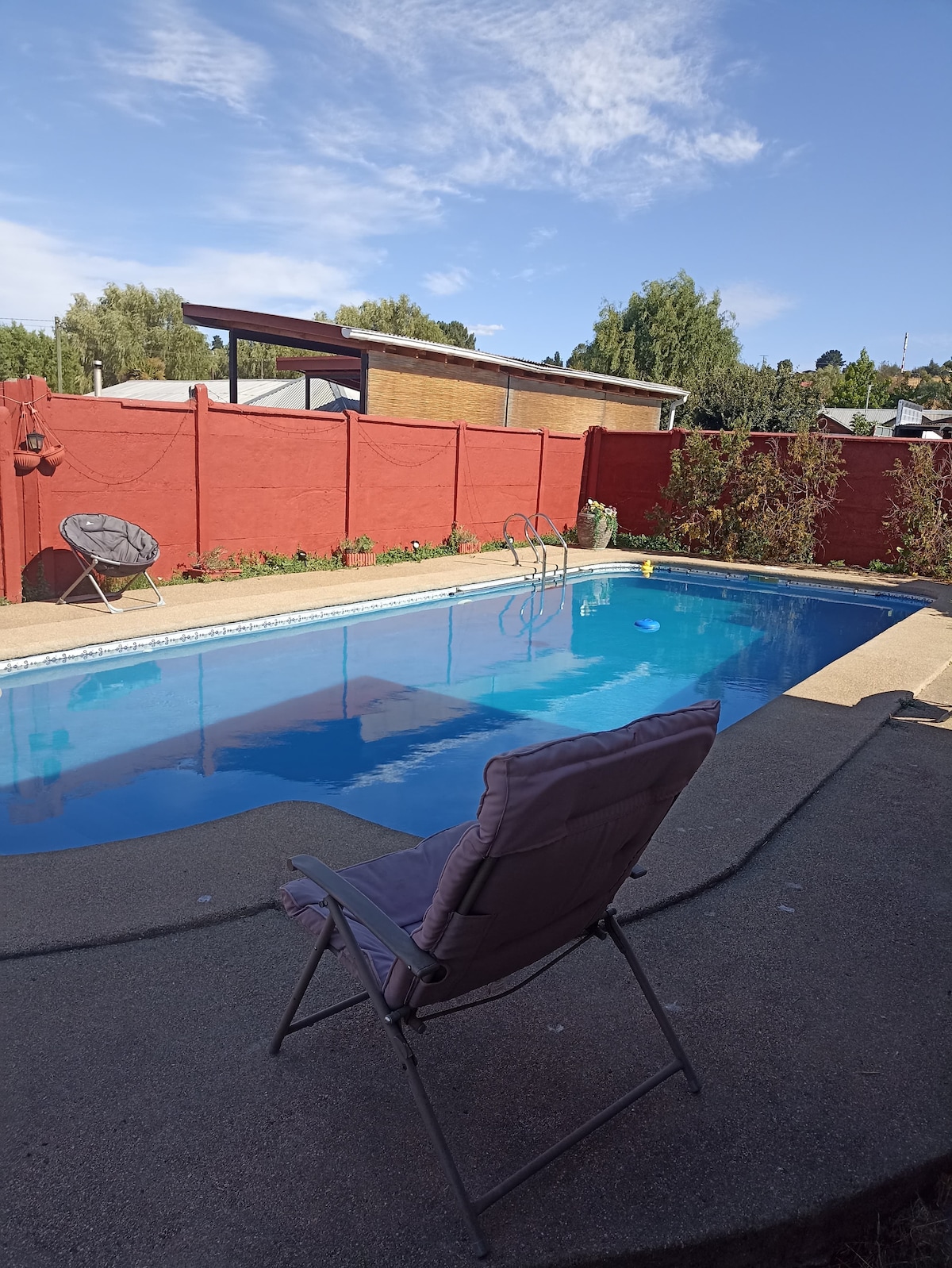 si deseas relajarte y descansar. Te ofrezco una hermosa casa de familia implementada para 09 personas. ubicada a tan solo 45 minutos de concepcion. En un lugar privilegiado. cuenta con piscina, piscina niños y tinaja caliente, con acceso a laguna. living comedor, cocina americana. con puertas -ventanas que dan directamente a piscina y terraza. dormitorio matrimonial con baño privado, dos dormitorios, cada uno con una cama y una litera (3 personas cada uno), pieza individual. baño completo