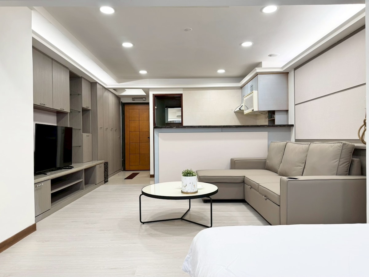室內的灰白主色,配搭北美木紋銅色傢俱及家飾, 用心為您的居住空間提供沈靜優雅的感覺。日韓系電器的選用,不論是無線充電藍牙喇叭,大螢幕伸縮高清電視,都能滿足您對影音效果的要求。房源位於高樓內縮樓層,阻絕不必要的噪音並滿足您對景觀,安靜及隱私的要求。大樓並配有全天候警衛,住戶專屬電梯,公用大露台,以及地下收費停車場, 位處西門町核心路段,無論搭乘捷運或自駕都非常方便。Earth tone- based interior design offers warming, calm, healing and delighted atmosphere. Room facilities, including double bed, en- suite bathroom with shower enclosure, air conditioning, smart 4K TV with movies/Netflix, WIFI internet, cove lighting and music player with wireless connection & USB charger ports.