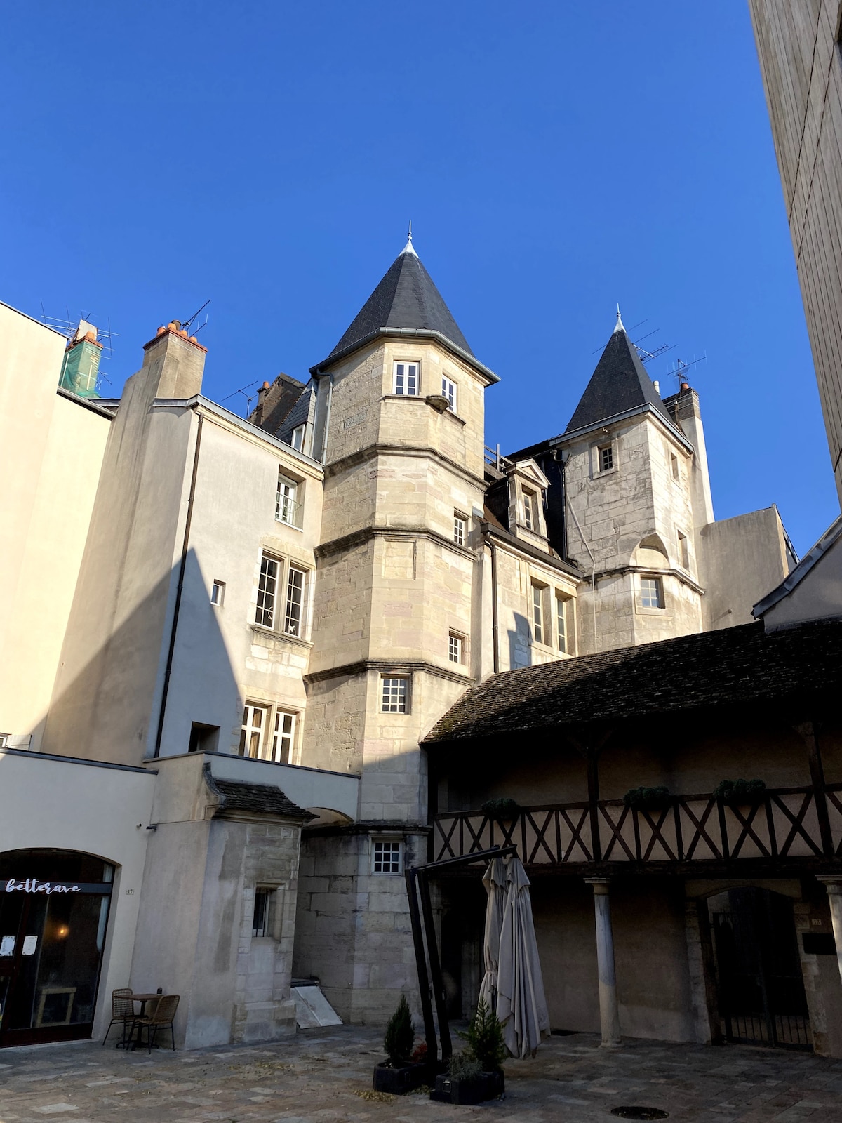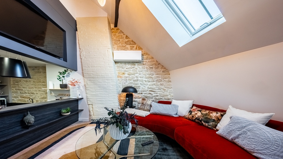 Bienvenue à La Cachette des Ducs, un écrin sous les toits dans un hôtel particulier du XVIIe siècle, entre poutres anciennes, design soigné et vue sur la Tour Philippe Le Bon. Rénové avec soin, ce cocon lumineux vous offre un refuge idéal pour une escapade à deux, dans un cadre paisible. Situé en hyper-centre, cet appartement vous place à quelques pas du Palais Des Ducs, des Halles de Dijon, des musées, de la rue de la Liberté et des meilleures adresses de la ville. Tout peut se faire à pied.