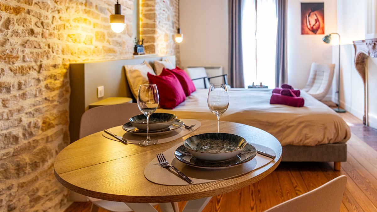 ARRIVÉE AUTONOME 24H/24 ANNULATION GRATUITE jusqu'à 24h avant l'arrivée STATIONNEMENT simple 2-5 MIN à pied GARE, PLACE DARCY, TRAM, PALAIS DES DUCS, CENTRE VILLE-HISTORIQUE Emplacement hyper centre pour cet appartement de caractère chic et élégant. Dotée d’une vue imprenable sur la Cathédrale Saint-Bénigne, cette suite de 40m2 rénovée et équipée dans un parfait équilibre de luxe et de raffinement. Boiserie, pierres apparentes, soyeuses textures… Dijon se révèle sous ses plus beaux jours !