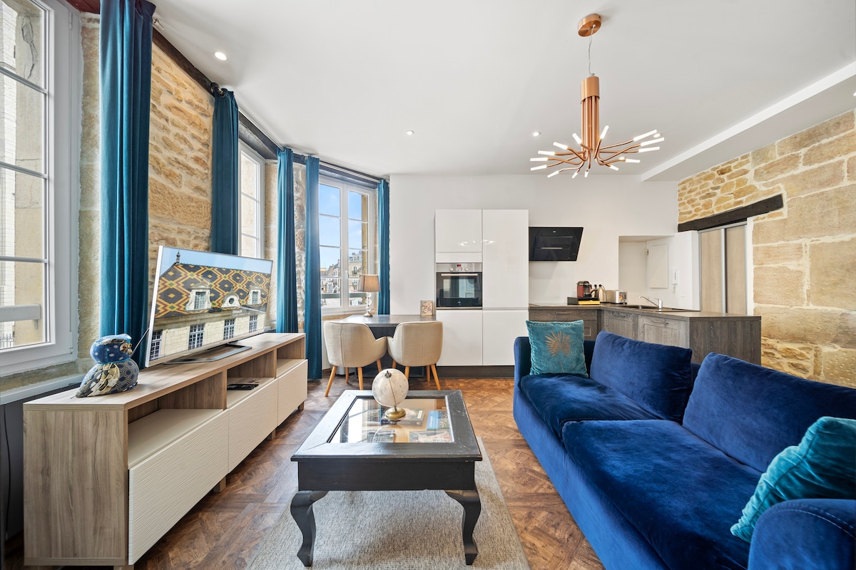 ARRIVÉE AUTONOME 24H/24 ANNULATION GRATUITE jusqu'à 5 jours avant l'arrivée STATIONNEMENT simple 2-5 MIN à pied GARE, PLACE DARCY, TRAM, PALAIS DES DUCS, CENTRE VILLE-HISTORIQUE Emplacement hyper centre pour cet appartement de caractère chic et élégant. Dotée d’une vue imprenable sur la Cathédrale Saint-Bénigne, cette suite de 40m2 rénovée et équipée dans un parfait équilibre de luxe et de raffinement. Boiserie, pierres apparentes, soyeuses textures… Dijon se révèle sous ses plus beaux jours !