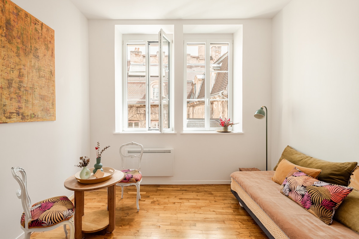 Ce loft climatisé est unique, il est situé en plein coeur du centre historique tout en étant au calme au fond d'une cour à proximité immédiate des Hospices. Il possède une vue incroyable sur la place Carnot et même sur le clocher des Hospices. Nous l'avons entièrement rénové et décoré avec des matériaux nobles de qualité. Plafond cathédrale impressionnant de 6m de hauteur, très lumineux. Parking gratuit à proximité, restaurants et commerces sur la place. Tout équipé et arrivée 24/24