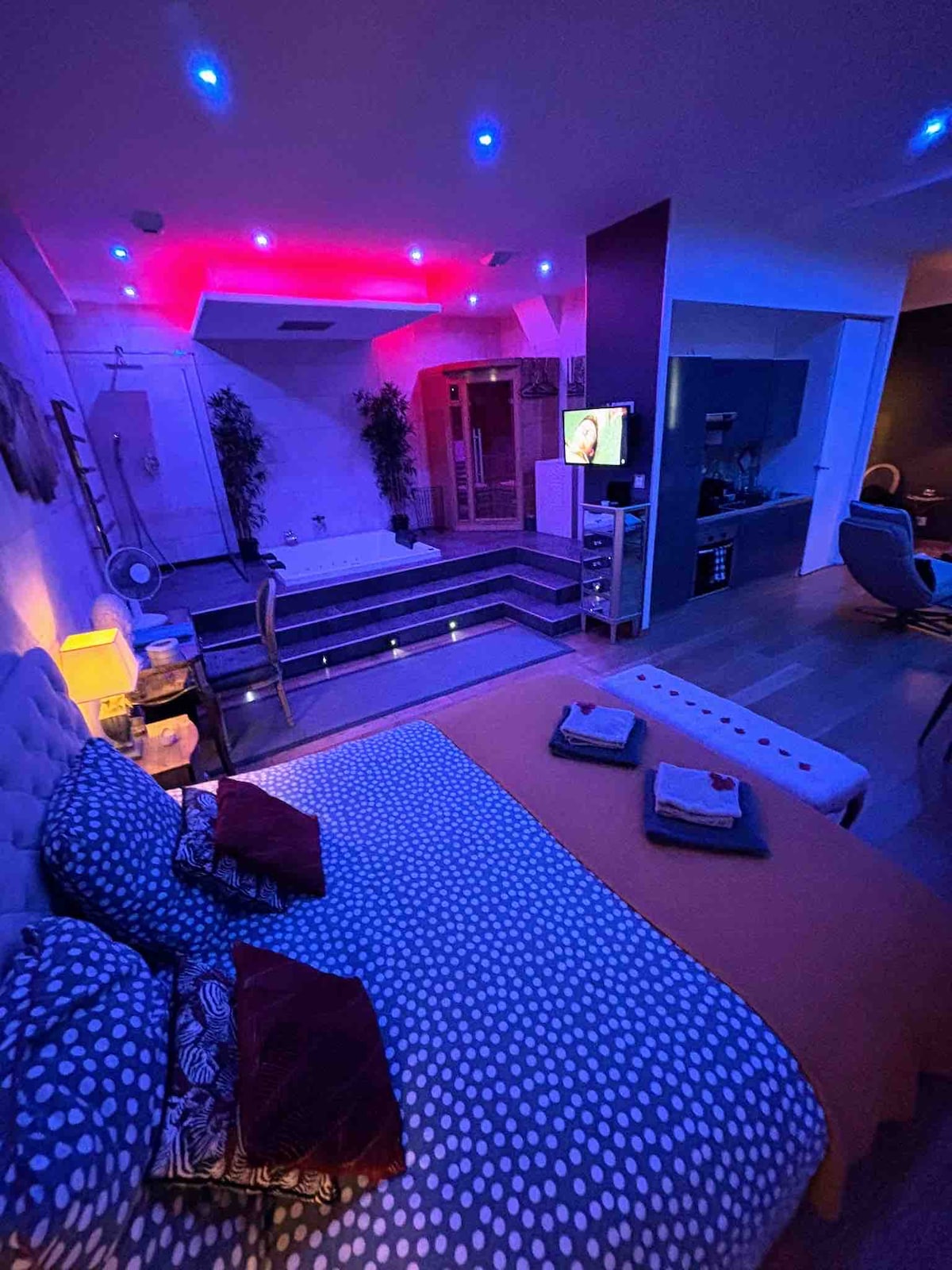 Spa privatif climatisé en plein coeur de Dijon dans une aile d'un Hotel particulier entièrement insonorisé équipé d'1 spa type jacuzzi professionnel face à face avec jet et leds TV visible depuis le spa, écran géant 3M sur 2M avec vidéo projecteur, douche tropical avec luminotéraphie, sauna infra rouge 3 places, lit king size, ciel de lumière / ruban de led à personnaliser, cuisine équipée. Fort de notre expérience dans les suites de luxes anthony vous accueillera dans les meilleures conditions.