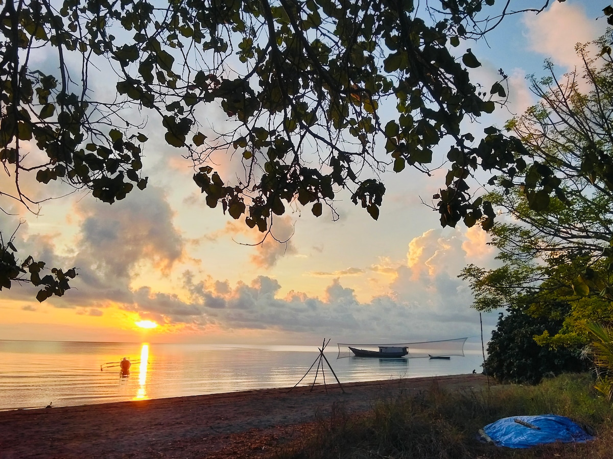 Tents are just above high tide mark facing east. You get full rising sun over the sea. Most nights, can clearly see milky way. Facilities are being improved. There is bathroom with shower, and basic kitchen. The island has no ATM, so bring US dollars. There are 4 restaurants, within a 50 cent p.u. taxi ride. Badminton & beach volleyball available. Soon, will have paddle boards - for the lake-like sea. Atauro island has some of the world's best snorkling and scuba sites