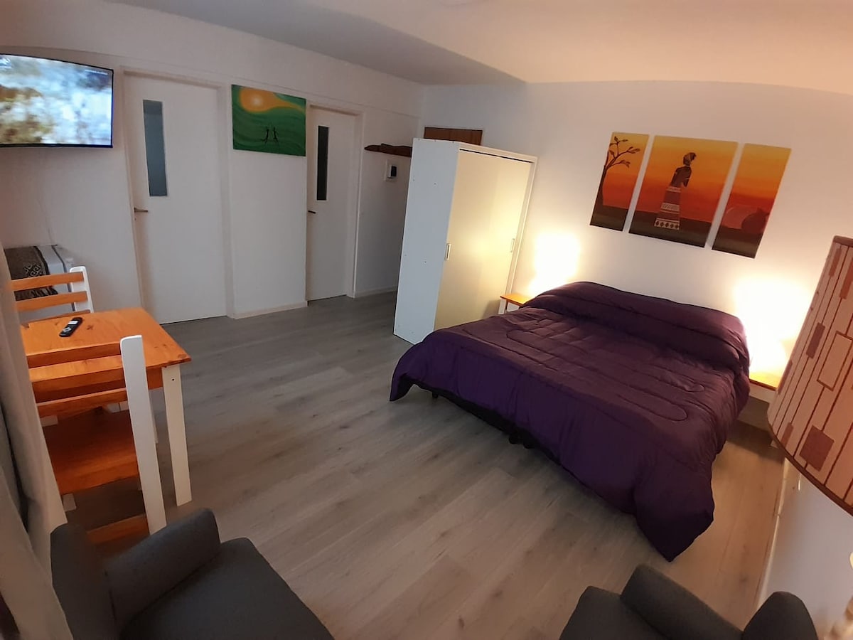 Si la idea es descansar y conectarse con la naturaleza, éste es el lugar. Ubicado en Circuito Chico brinda la posibilidad de realizar recorridos a pie o en kayak que serán recuerdos inolvidables. Bajando la escalera pueden acceder a una tranquila playa en la costa del Lago Moreno o disfrutar de la vista desde el deck o el jardín. Éste pequeño y acogedor estudio es la forma que encontramos de compartir nuestro lugar en el Mundo. ES INDISPENSABLE TENER AUTO.